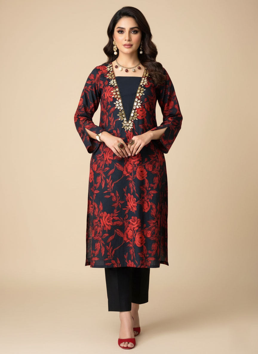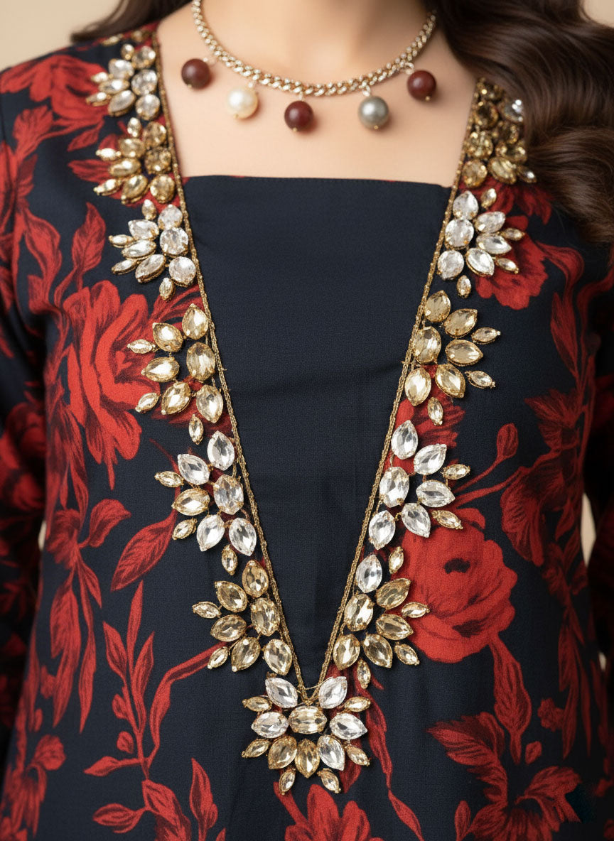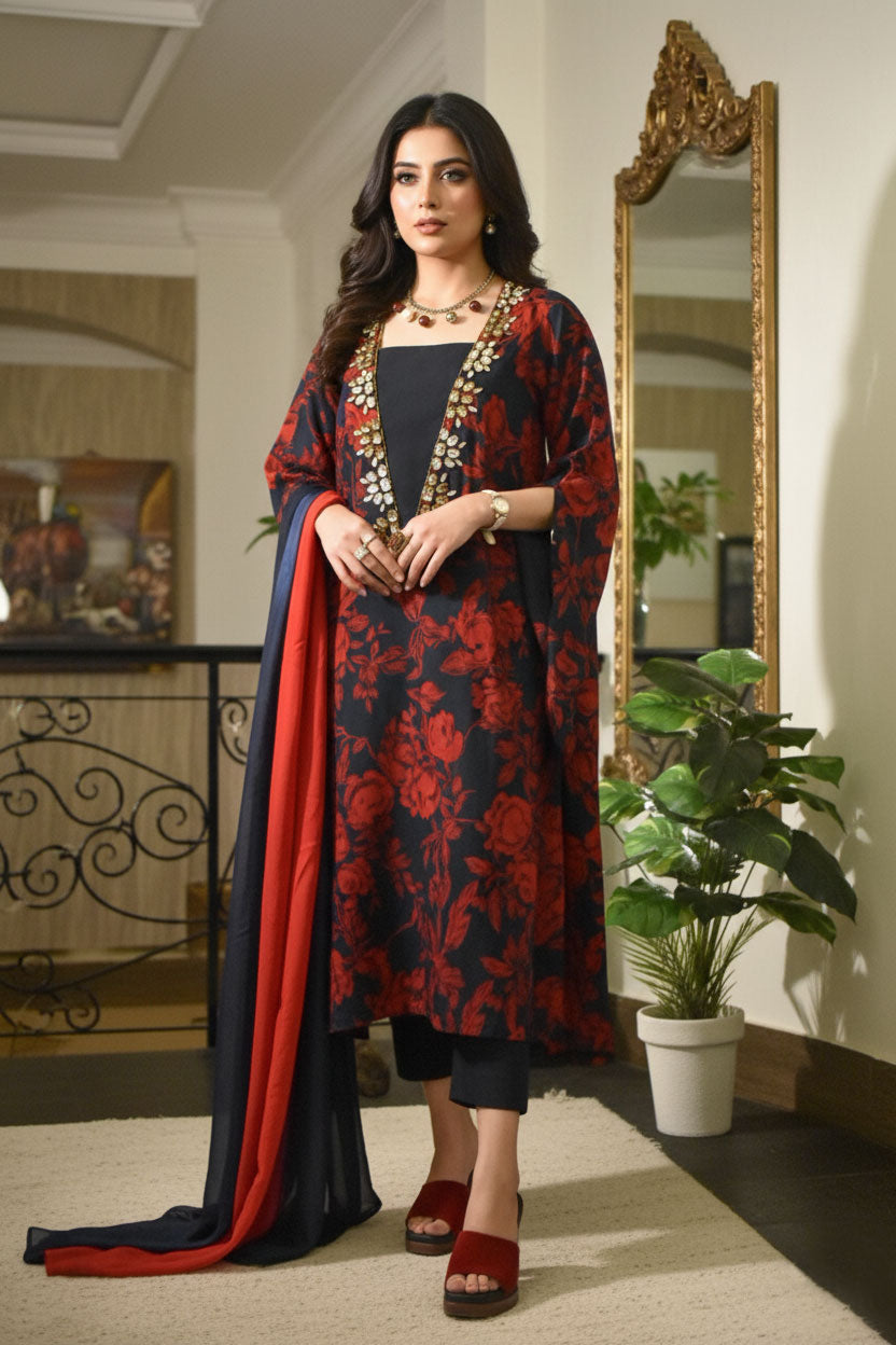 Make an elegant statement with this captivating blue and red floral printed crepe ensemble, designed to bring contemporary charm to any occasion. The long shirt features delicate crystal work along the neckline and stylish slitted sleeves, paired with a luxurious silk dupatta finished with tassels for a refined touch. Perfect for festive dinners, semi-formal events, or evening gatherings where sophistication meets effortless grace.