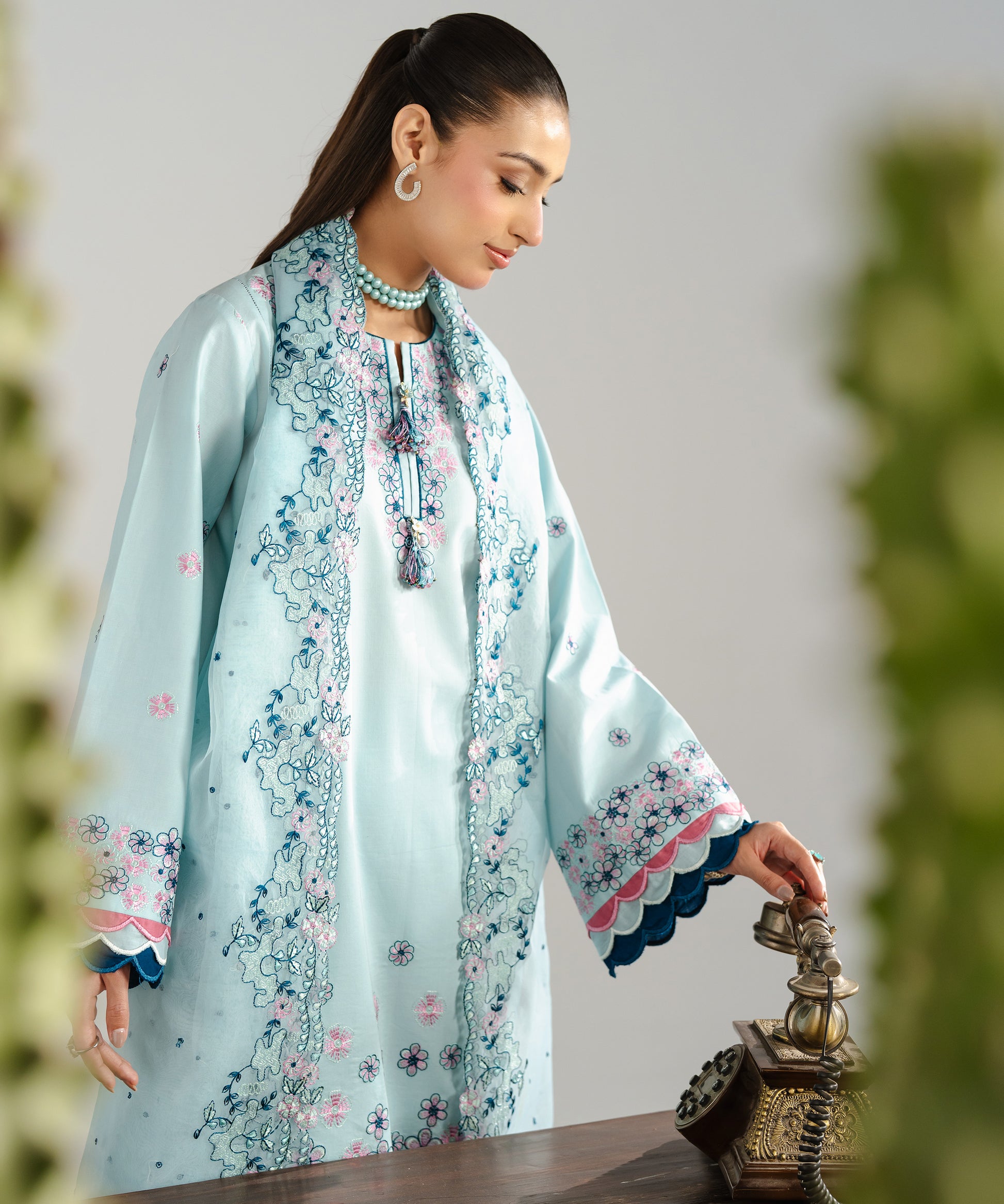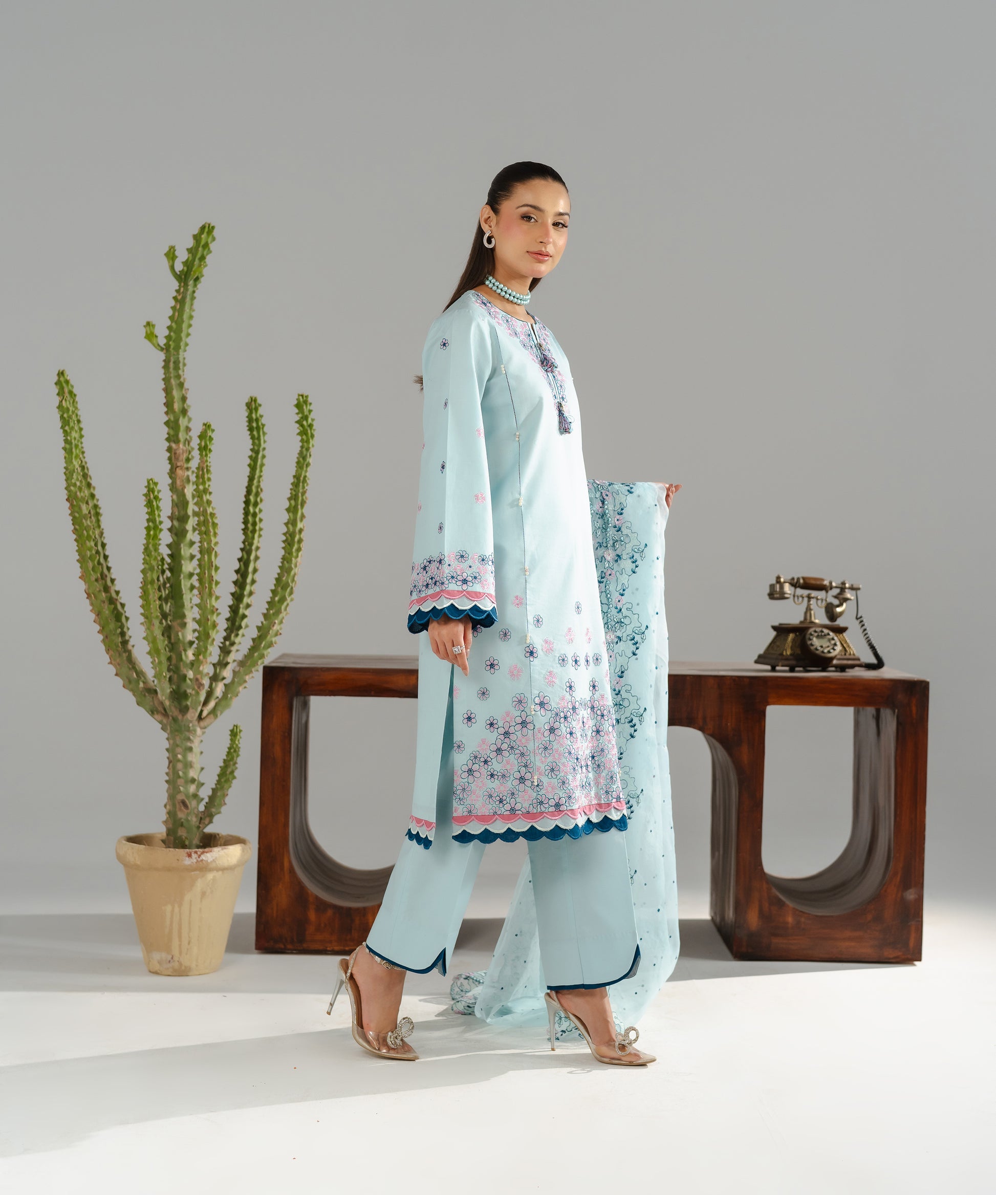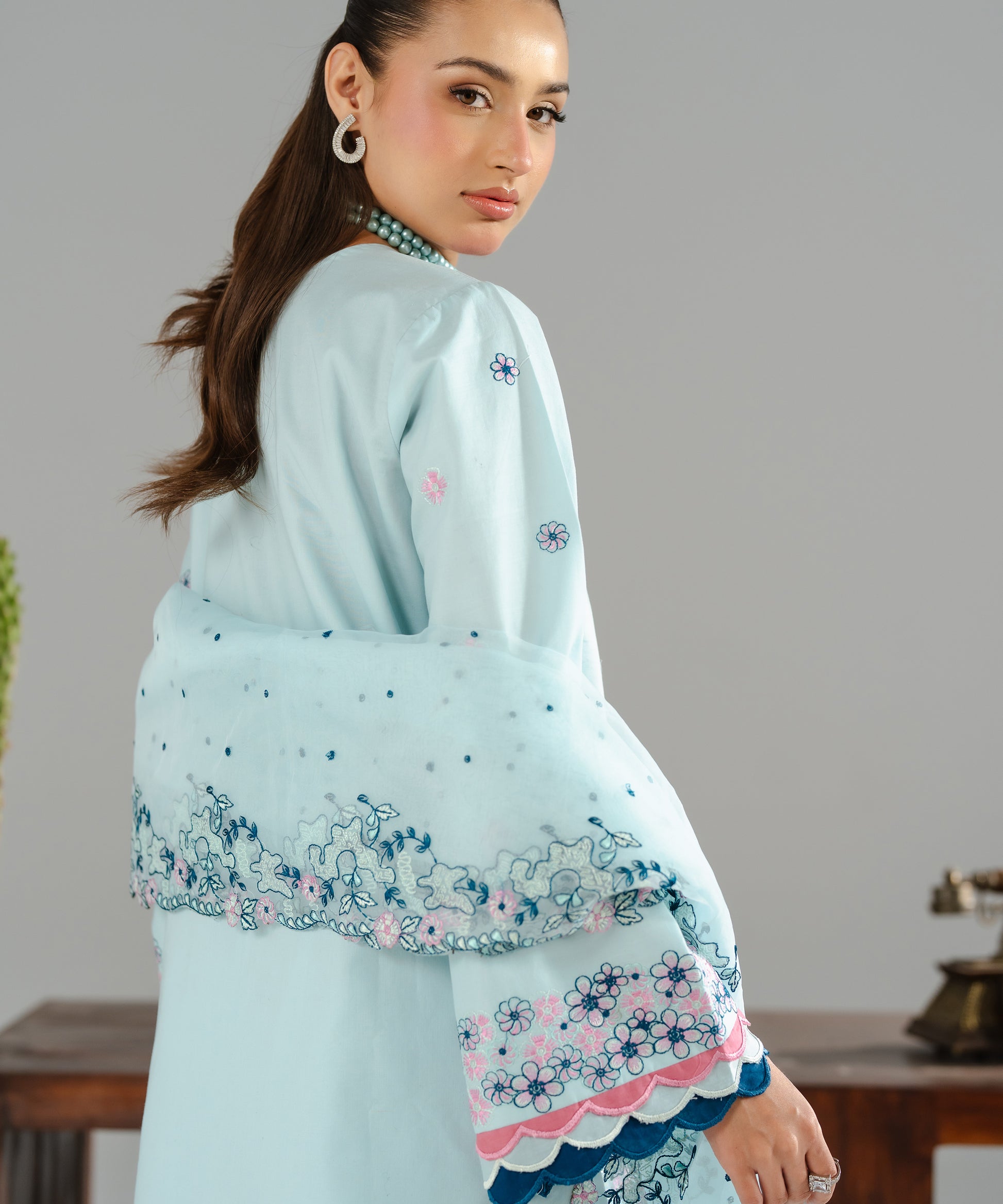 Inhale the calmness of clear horizons with Azure, a serene light blue 3-Piece Suit inspired by soft skies and delicate spring blossoms. This thoughtfully crafted ensemble features a soft gradient effect, where intricate floral embroidery is denser at the hem and gently fades upward for a fluid, airy look. Fine resham threadwork in pastel tones maintains a sense of refined delicacy, paired with tailored trousers featuring a unique, rounded hem cut. A sheer organza dupatta completes the look, offering a light, floating effect finished with a dreamy, cloud-like embroidery touch.
