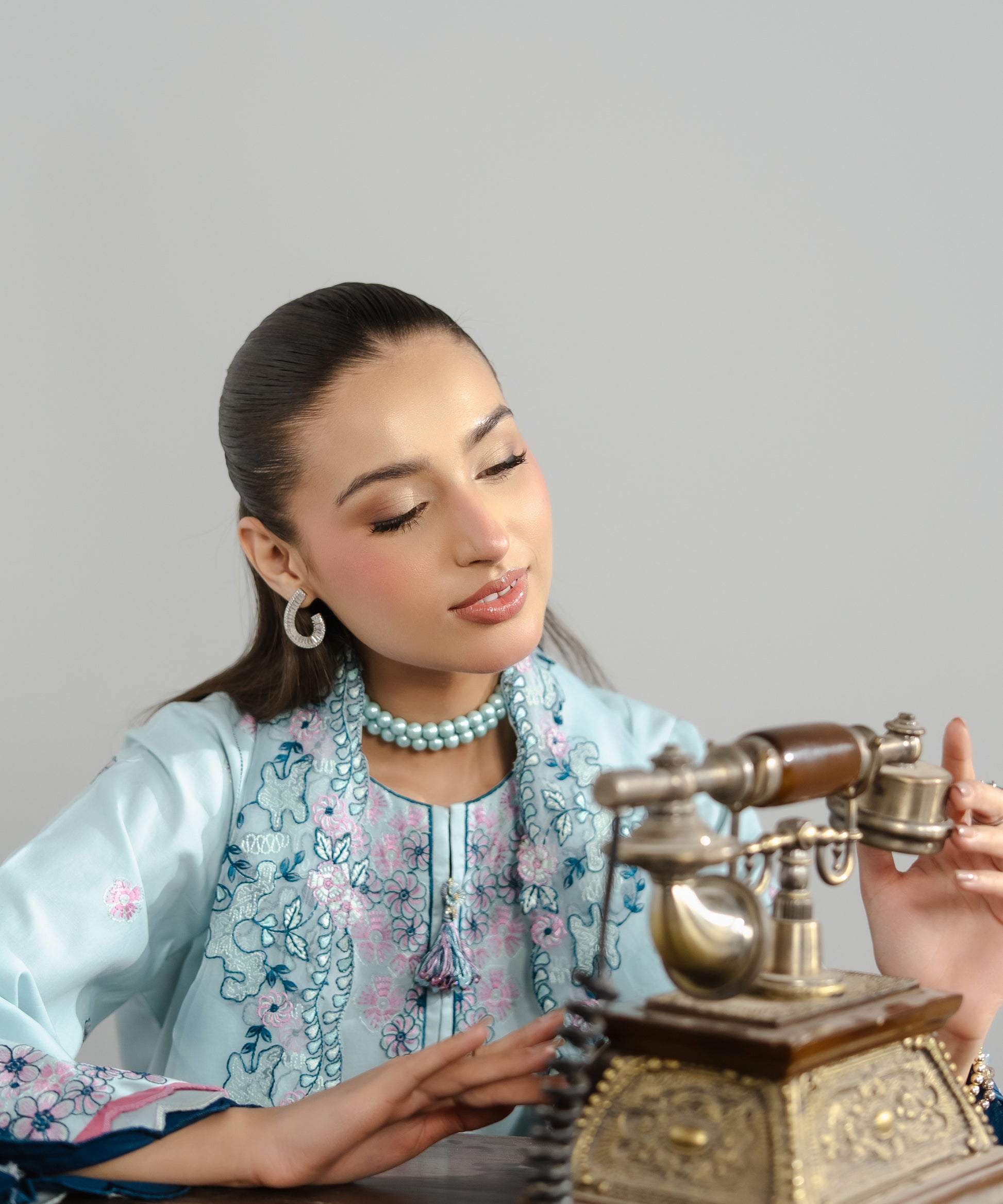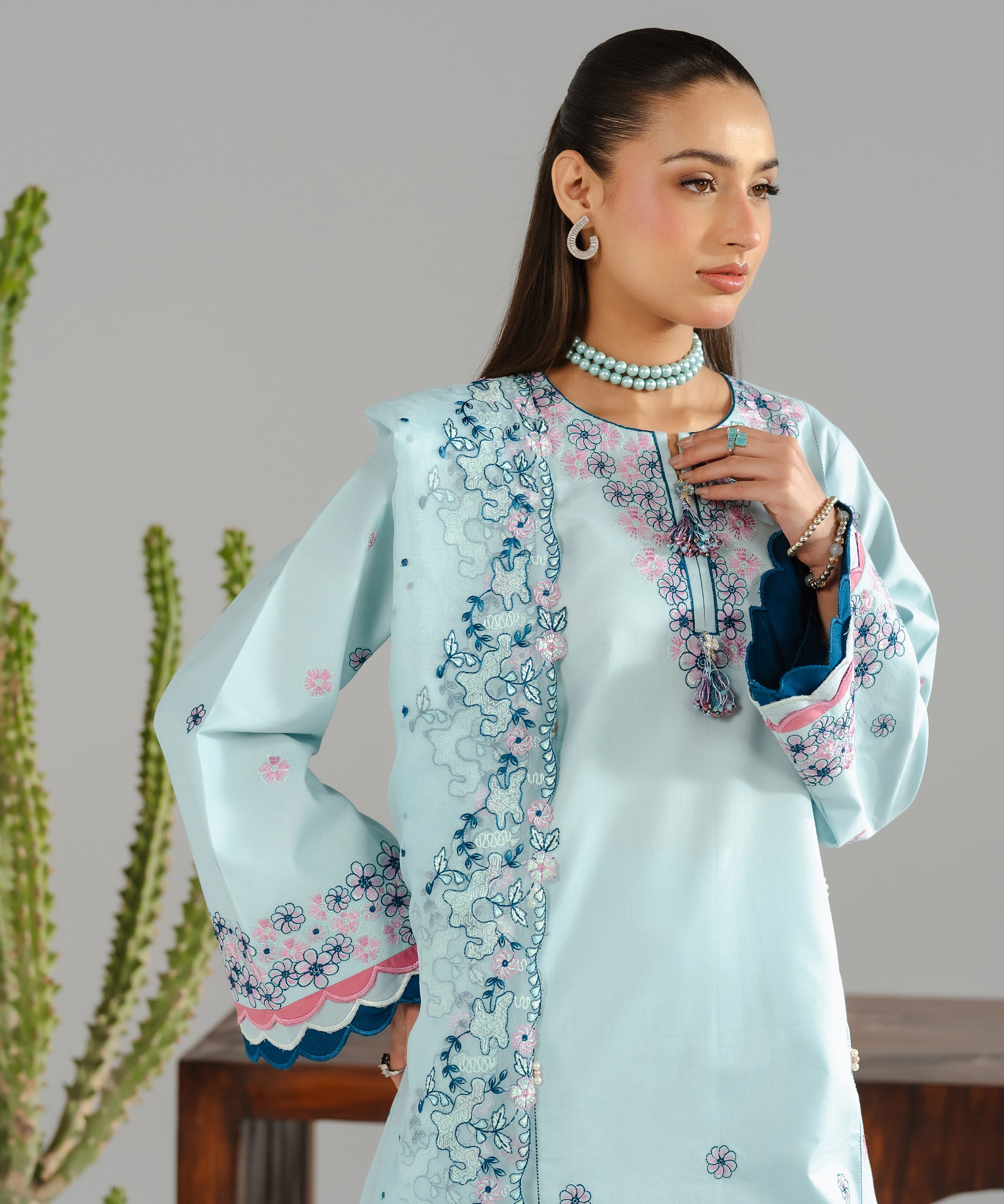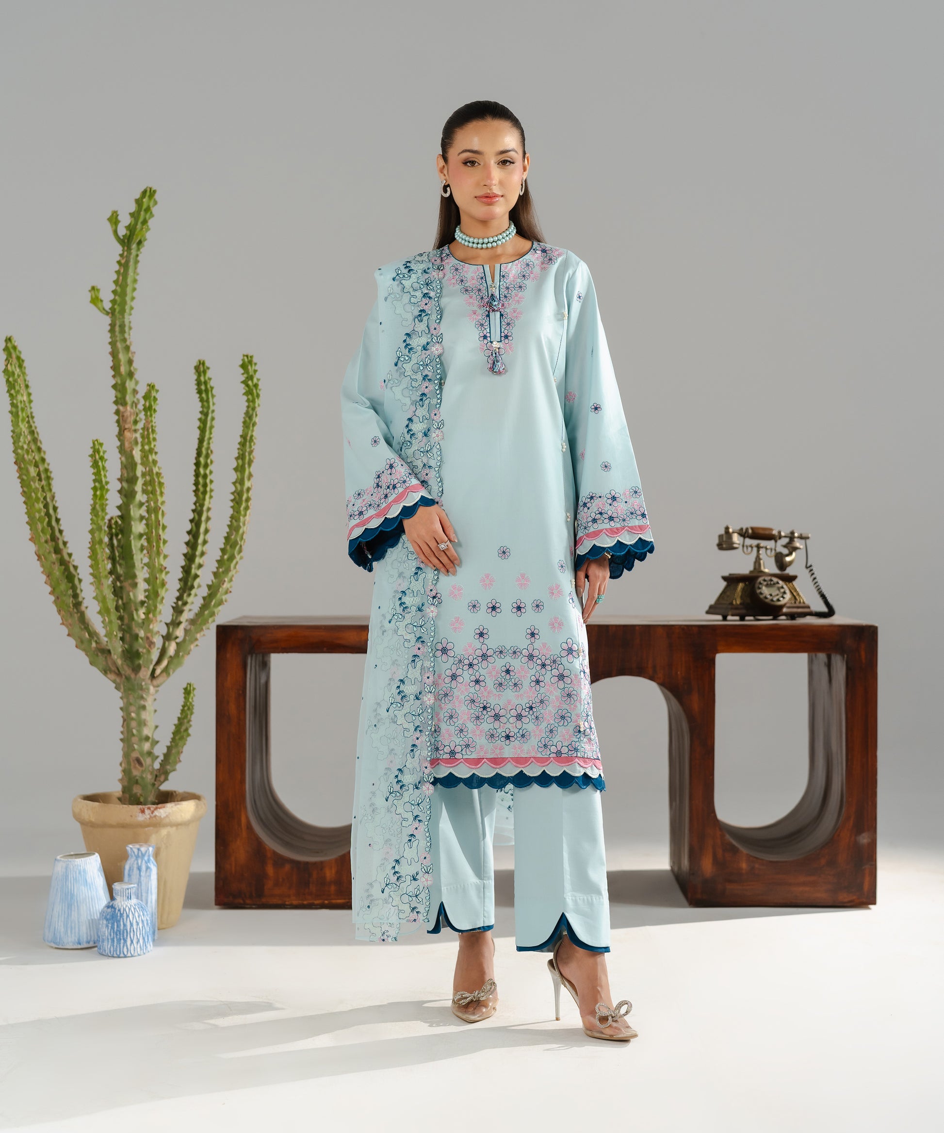 Inhale the calmness of clear horizons with Azure, a serene light blue 3-Piece Suit inspired by soft skies and delicate spring blossoms. This thoughtfully crafted ensemble features a soft gradient effect, where intricate floral embroidery is denser at the hem and gently fades upward for a fluid, airy look. Fine resham threadwork in pastel tones maintains a sense of refined delicacy, paired with tailored trousers featuring a unique, rounded hem cut. A sheer organza dupatta completes the look, offering a light, floating effect finished with a dreamy, cloud-like embroidery touch.