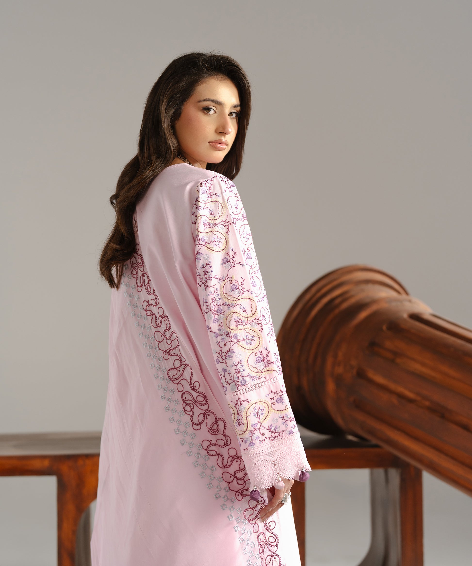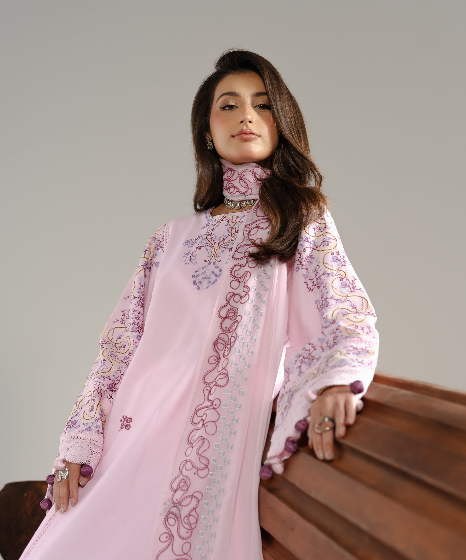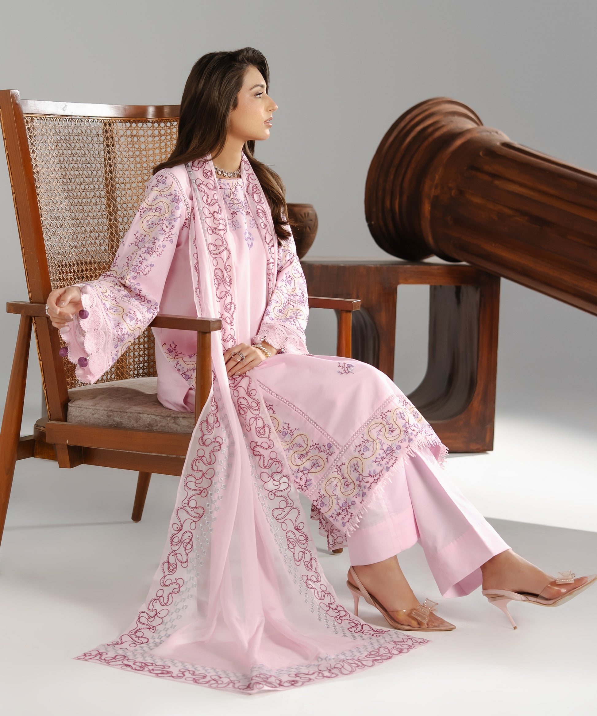 Experience a breath of fresh air with Haya, a 3-Piece Suit designed to feel airy, feminine, and utterly refined. The soft light pink base serves as a delicate canvas for embroidery in blended rose pink and lilac-purple tones, adding poetic depth without overpowering the look. Featuring a straight-cut shirt for an elongating silhouette and trousers with a slight ankle taper for a modern touch, this ensemble is completed by a chiffon dupatta for a soft, graceful fall.