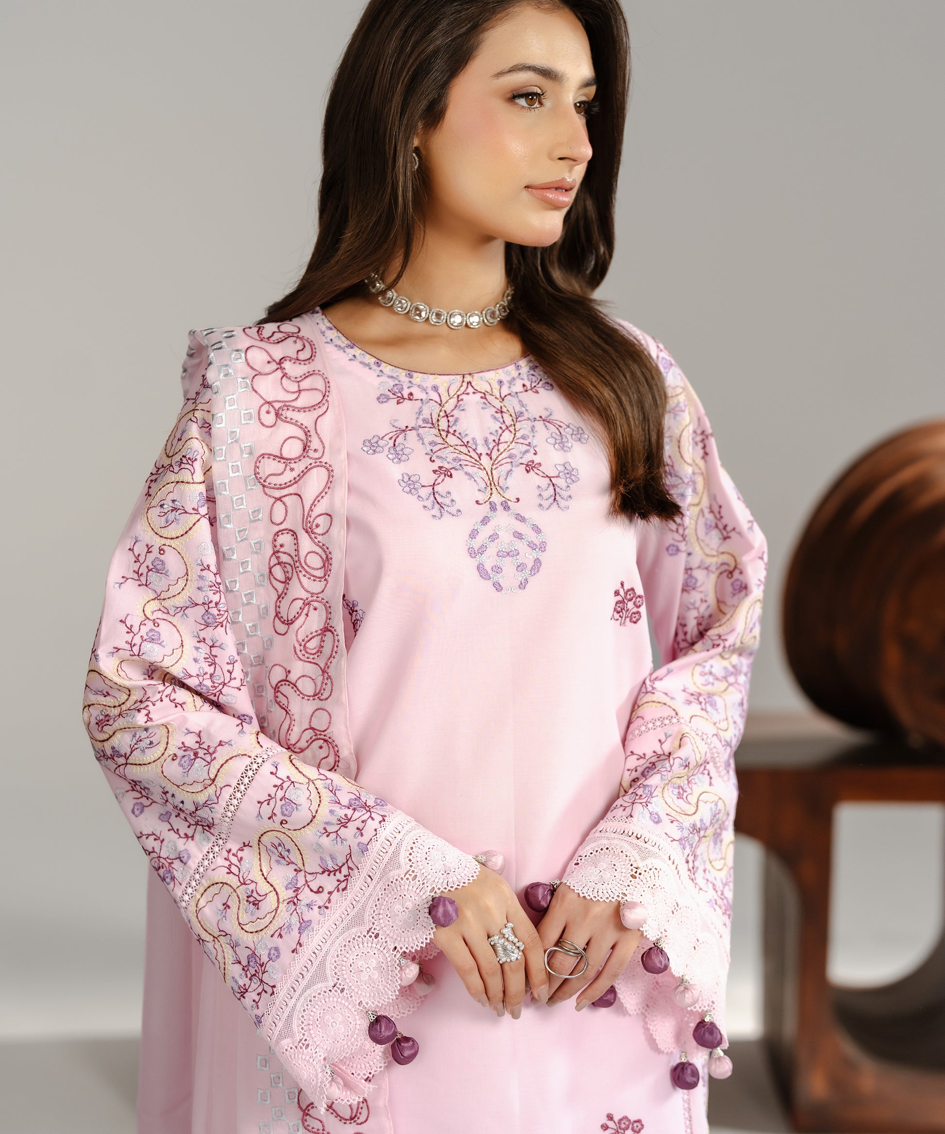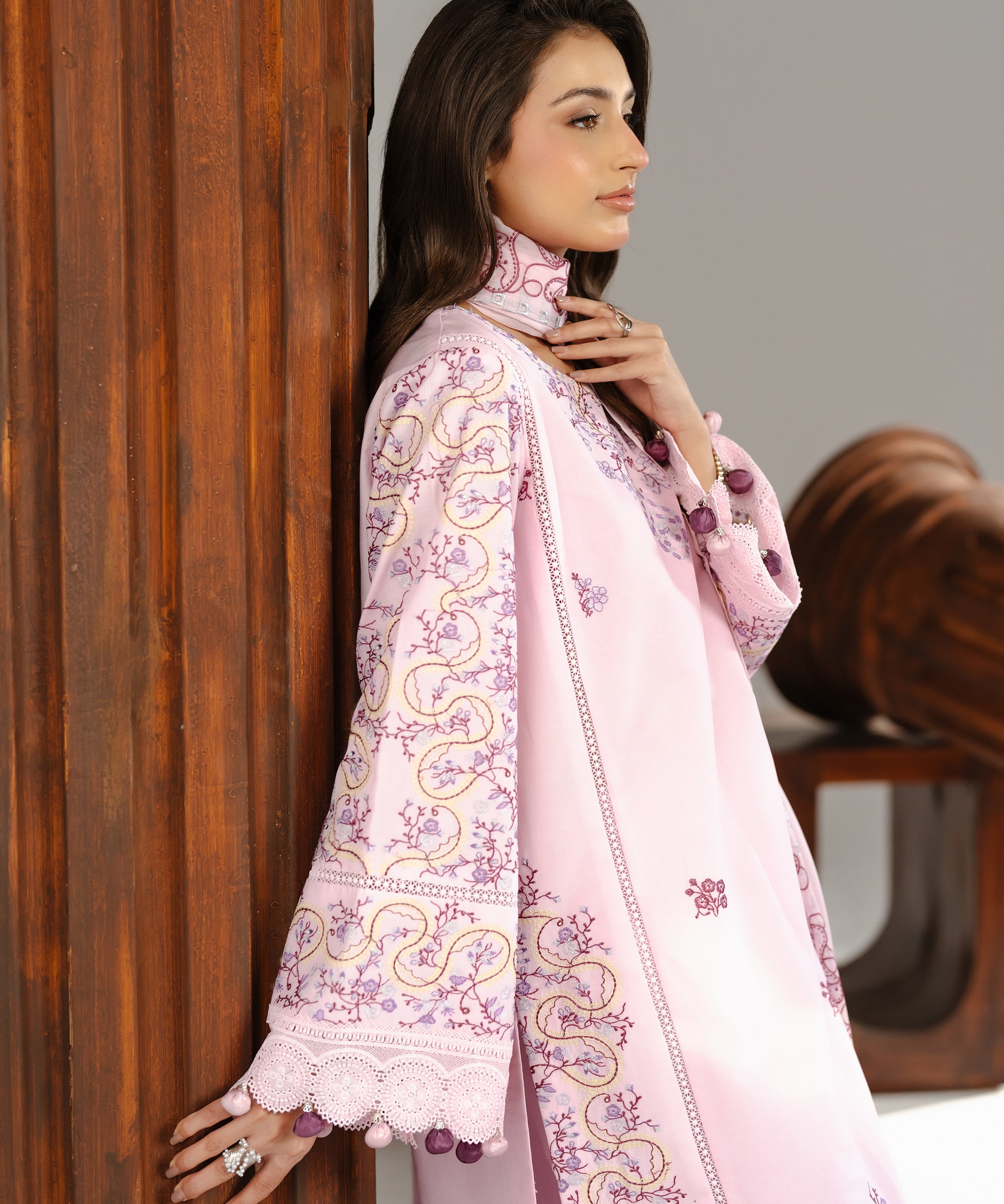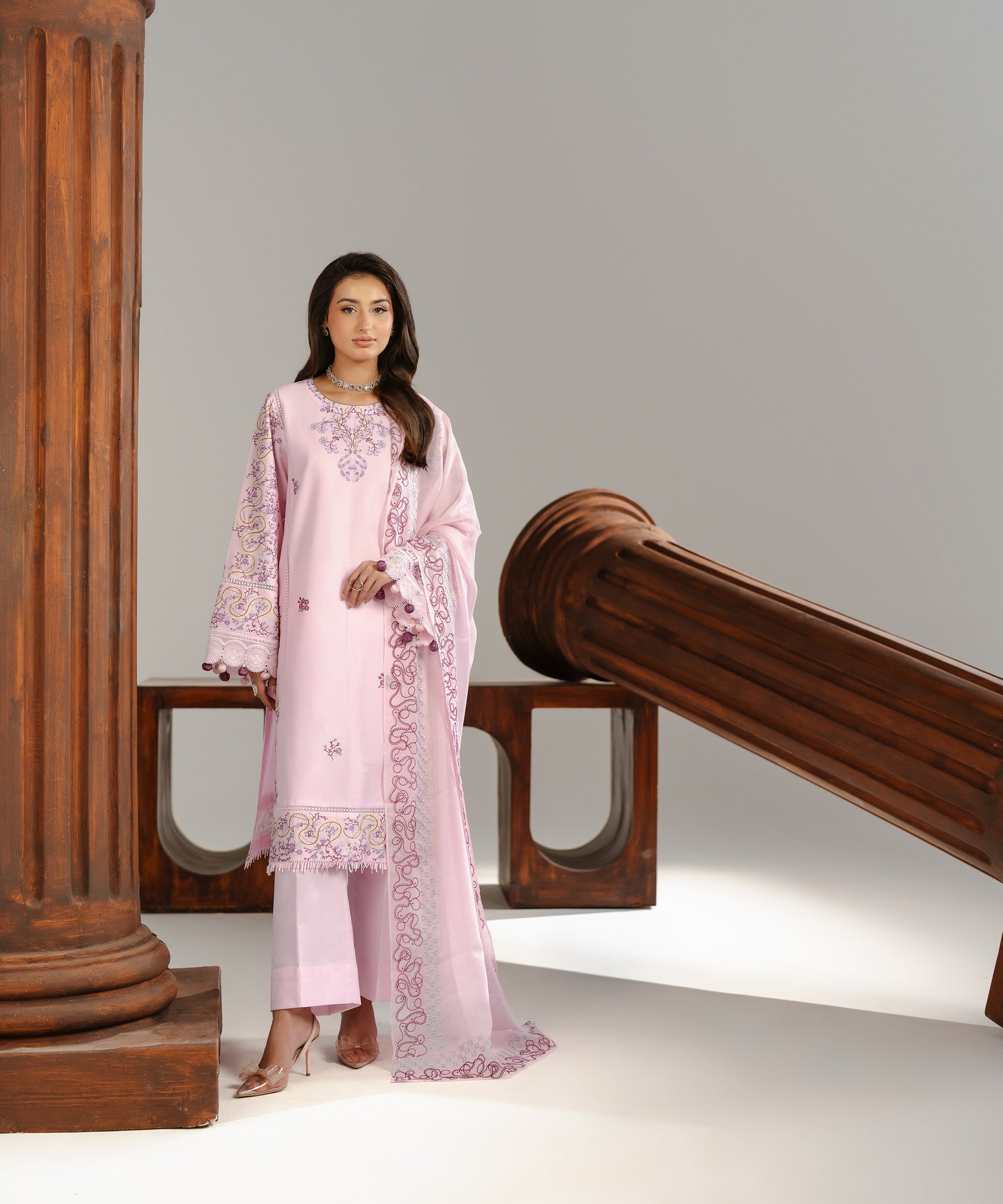 Experience a breath of fresh air with Haya, a 3-Piece Suit designed to feel airy, feminine, and utterly refined. The soft light pink base serves as a delicate canvas for embroidery in blended rose pink and lilac-purple tones, adding poetic depth without overpowering the look. Featuring a straight-cut shirt for an elongating silhouette and trousers with a slight ankle taper for a modern touch, this ensemble is completed by a chiffon dupatta for a soft, graceful fall.