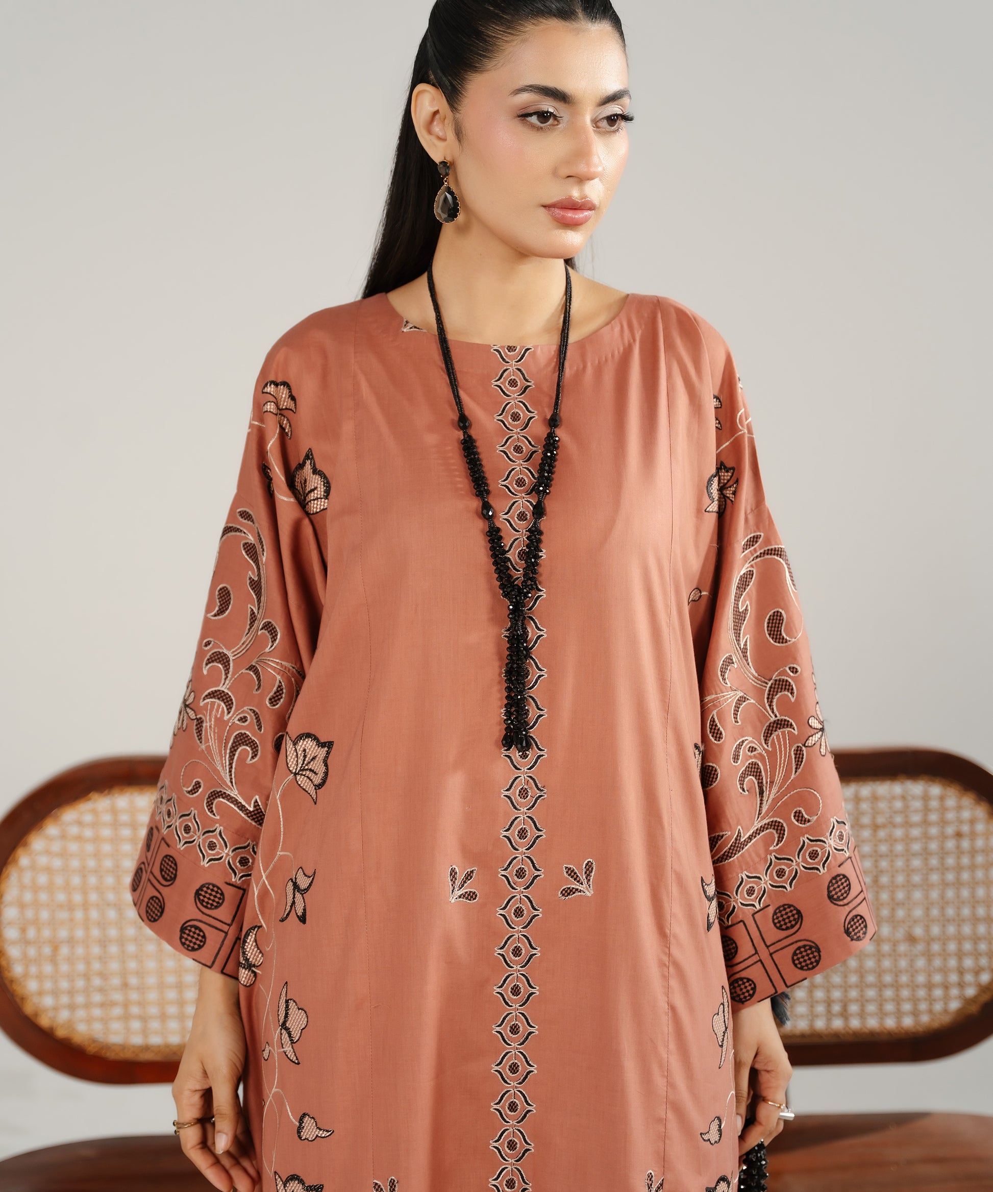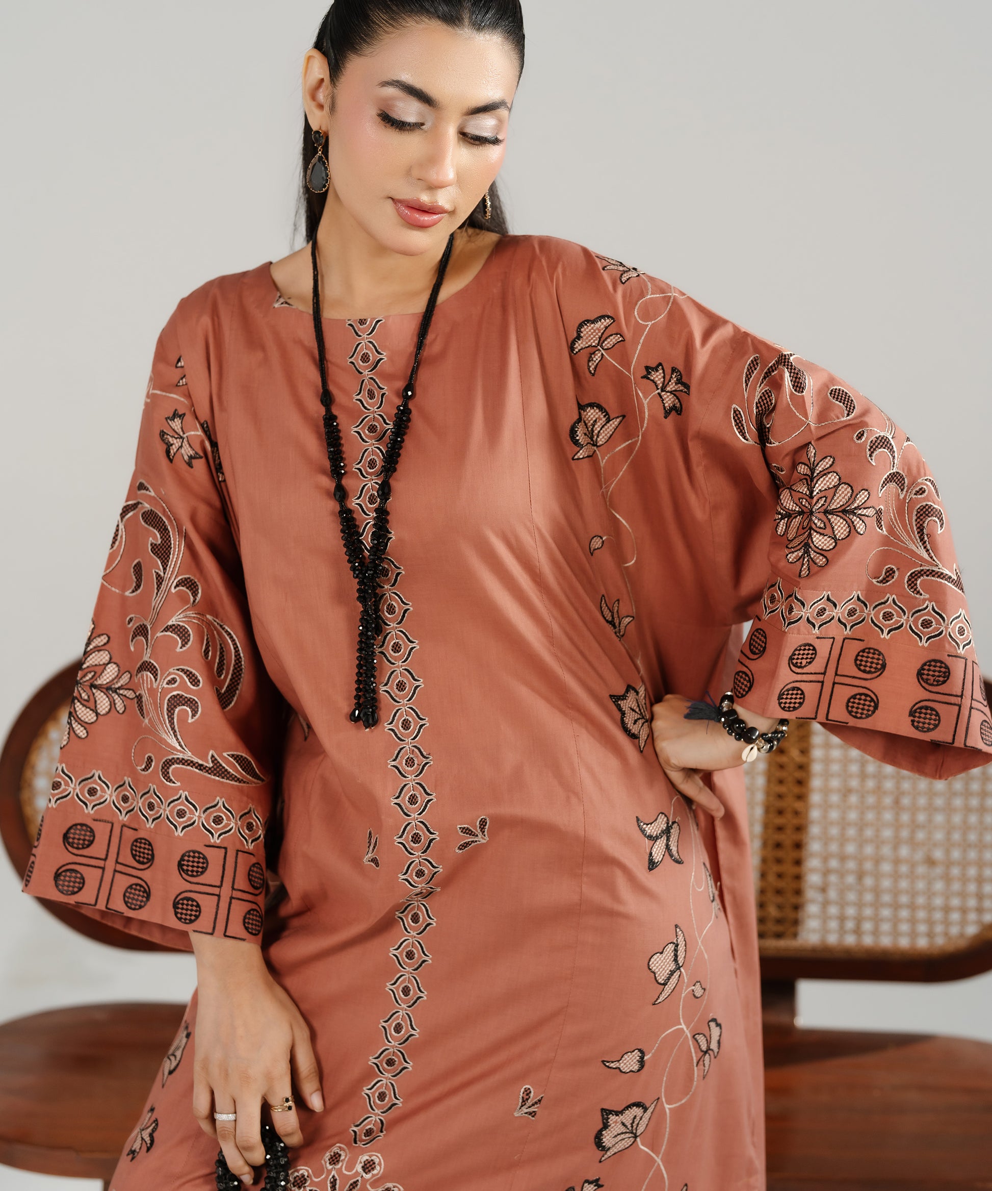 The silhouette features a flowing lawn shirt adorned with bold black motifs and intricate detailing that anchors the soft hue with a striking, contemporary edge. Paired with structured cambric trousers, this set offers a breathable yet refined look perfect for transitional season soirées or elevated daily wear.