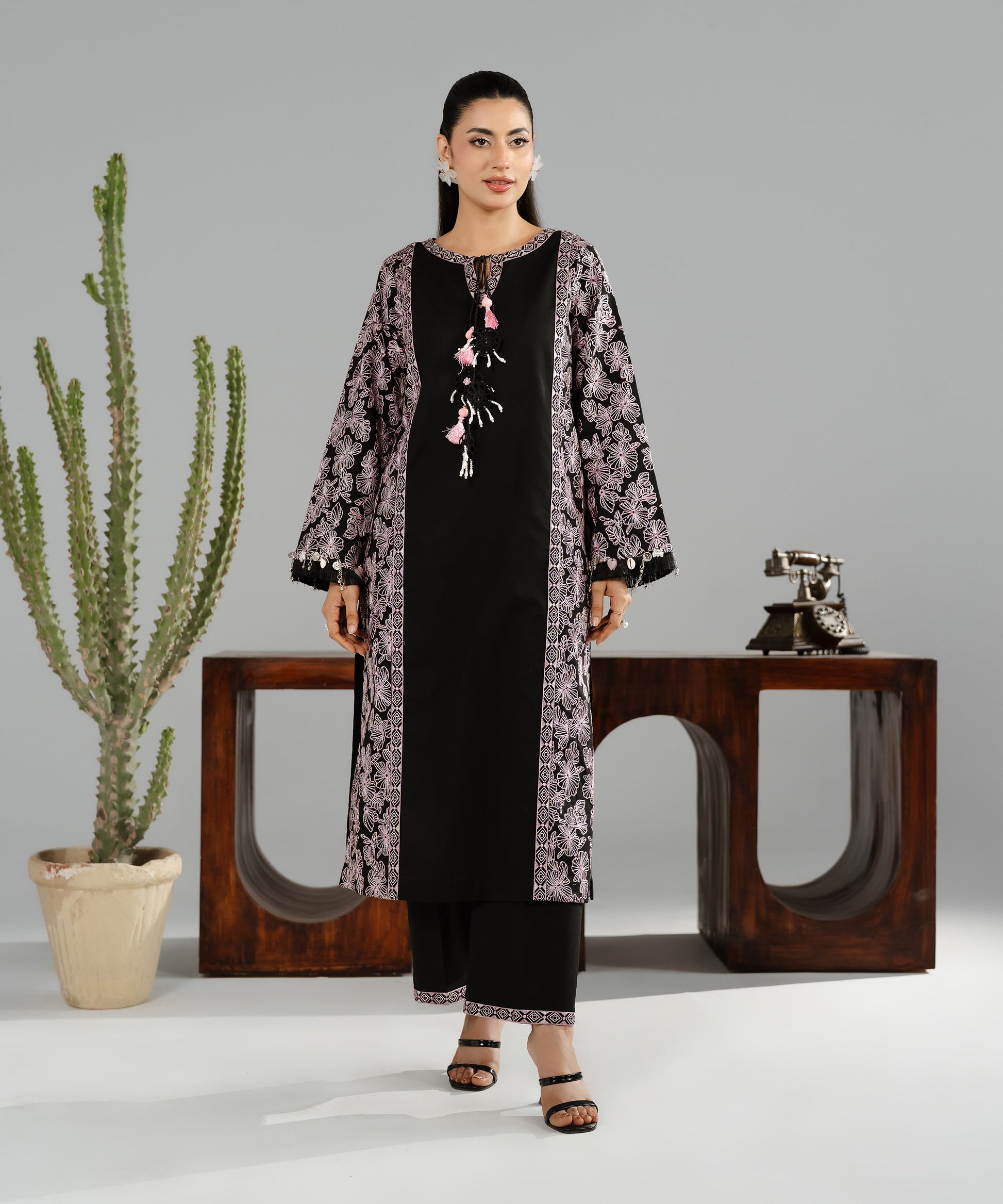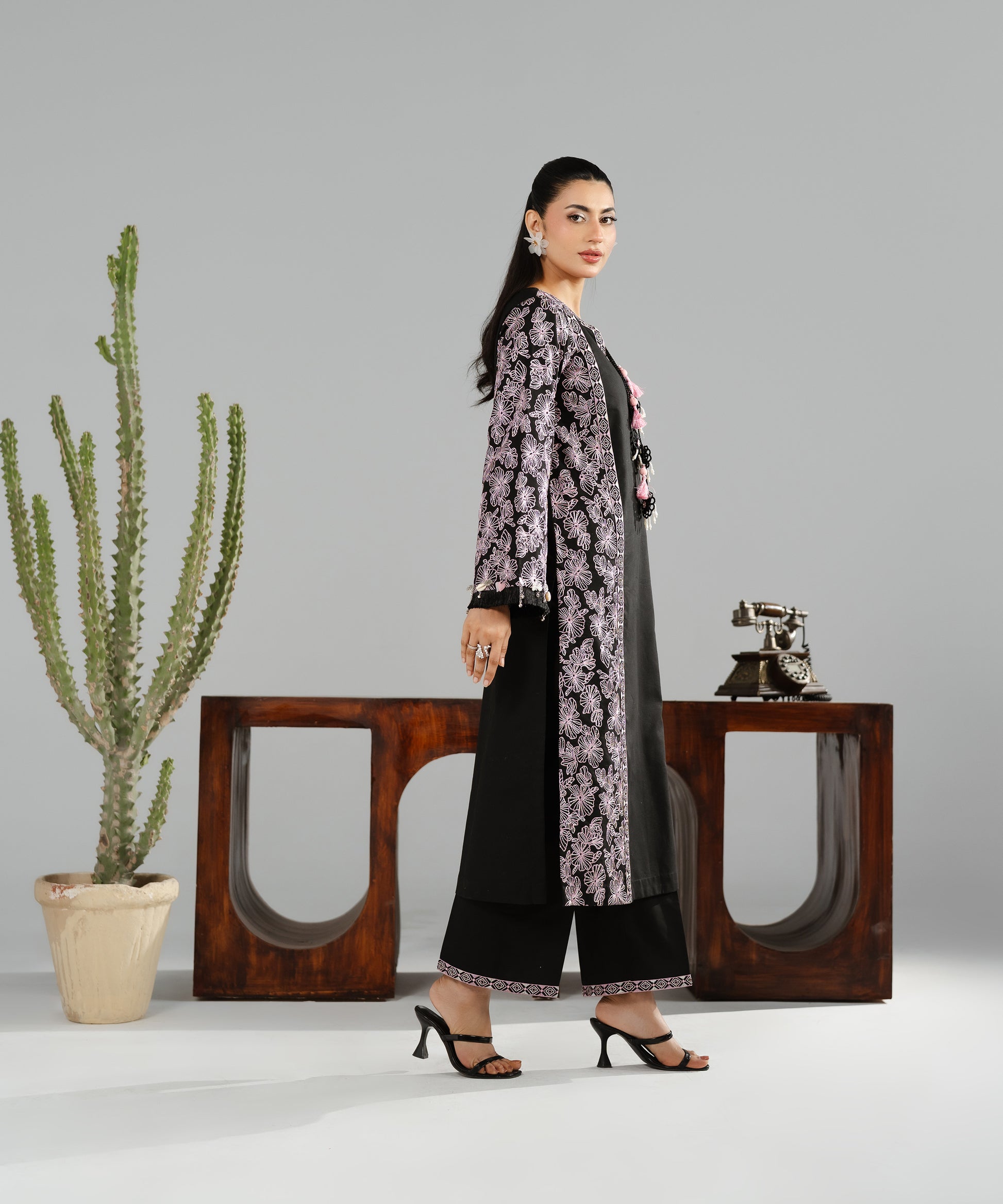 Redefine timeless sophistication with Zebaish, a 2-Piece Suit in deep black designed with a sleek straight silhouette. This ensemble is elevated by statement embroidery placements, where soft pink and white floral side panels run vertically to frame the body and enhance the silhouette. Paired with straight black trousers for a polished finish, Zebaish offers a striking, refined look for any formal occasion.
